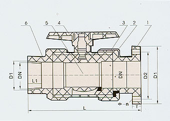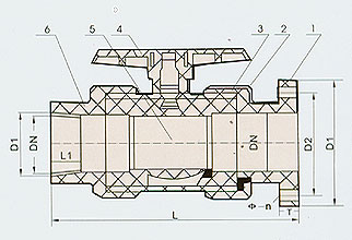 1、連接法蘭 2、壓緊螺母 3、閥體 4、手柄 5、閥球體 6、螺紋接管